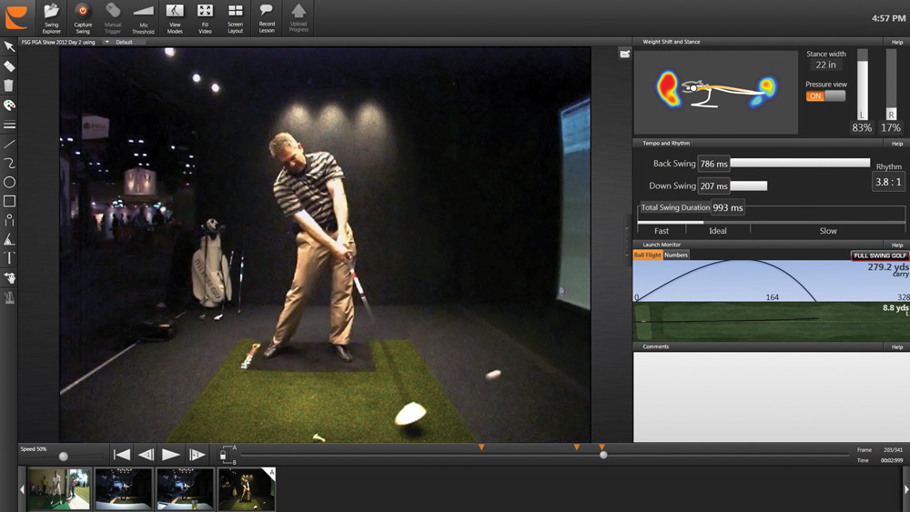 The Full Swing simulator, balance plate data, high definition video, and intuitive software tools are perfectly synchronized to provide a complete overview of your swing in motion.